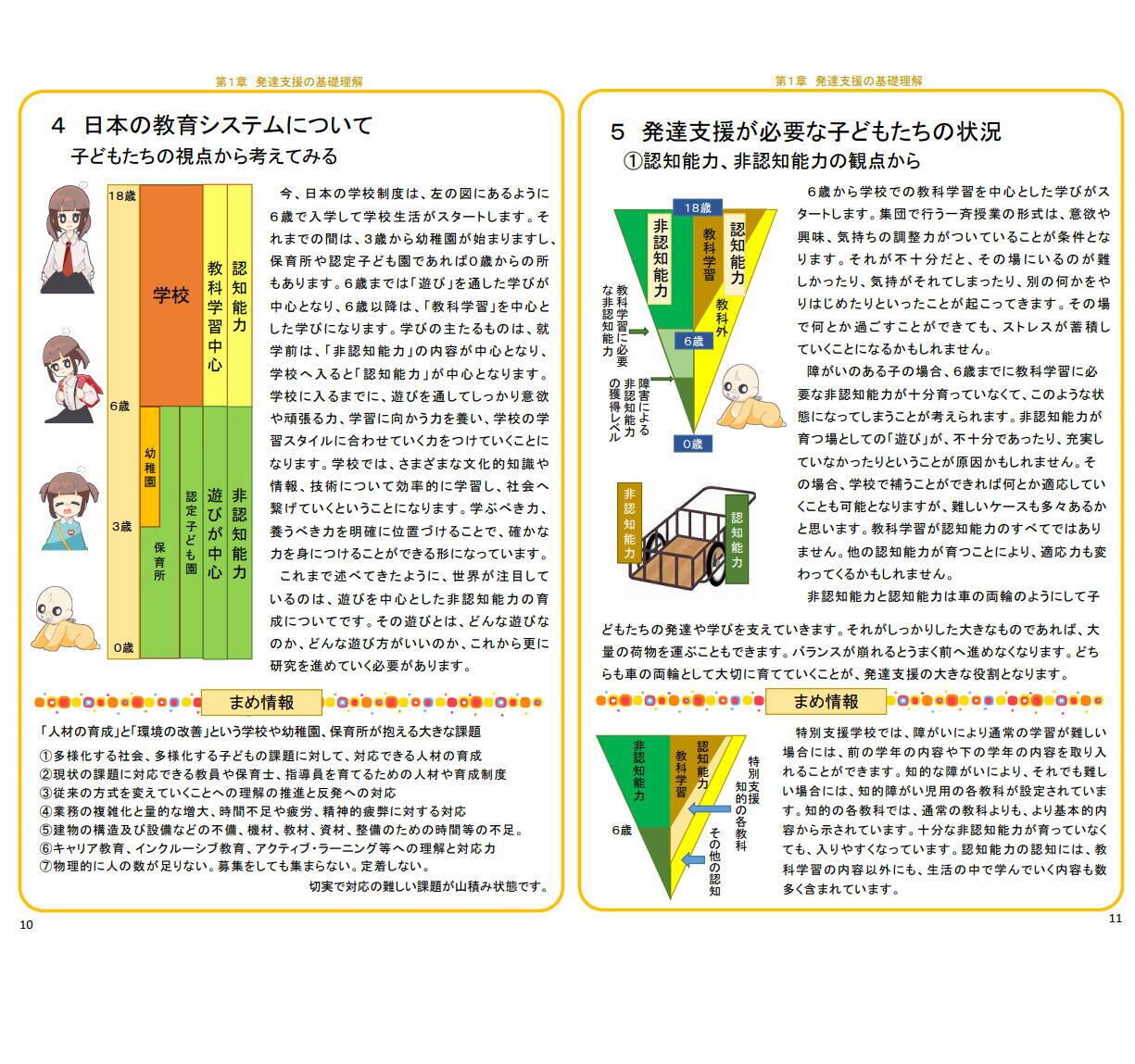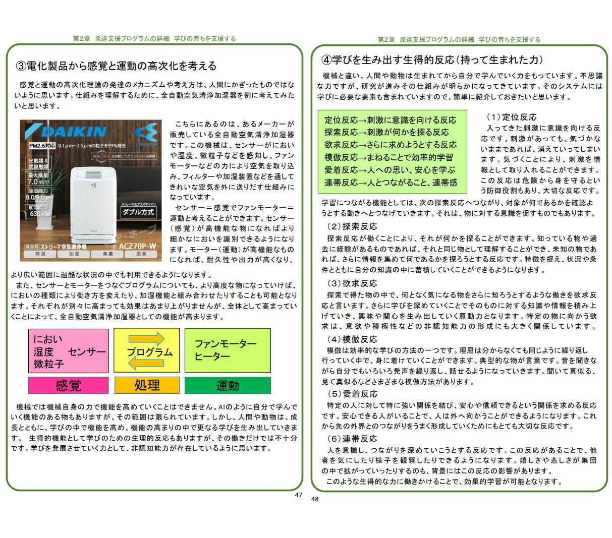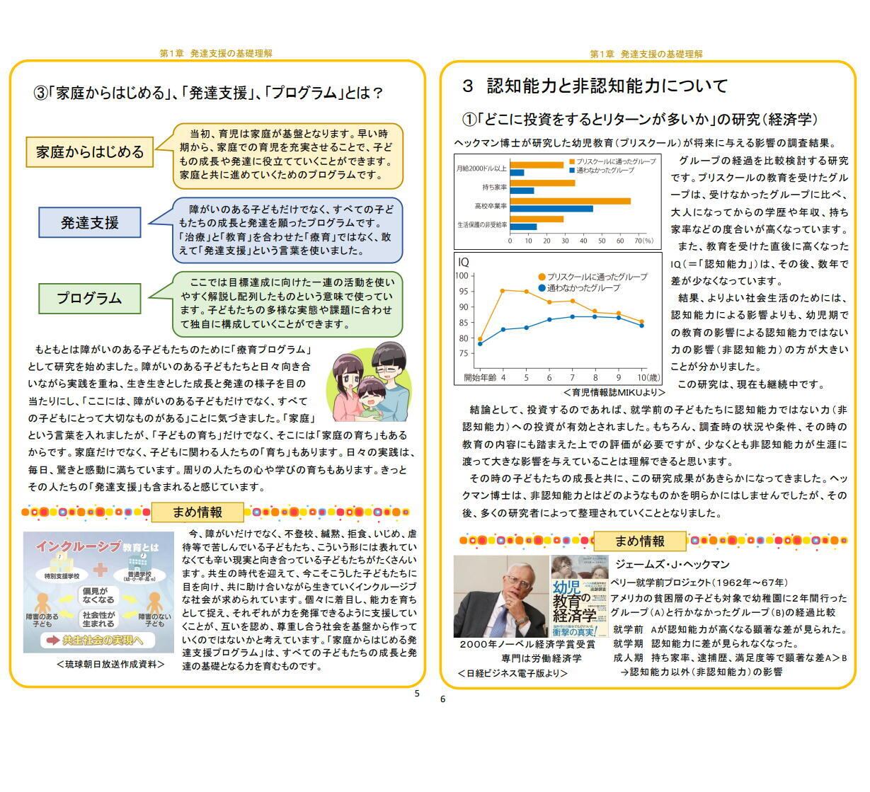 家庭からはじめる発達支援プログラムベーシックガイドは、今、世界が注目している非認知能力に着目し、その考えを発達支援の中に取り入れた新しい発達支援の考え方です。非認知能力とは、例えば、目標に向かって頑張る力、他の人とうまく関わる力、感情をコントロールする力などです。 数がわかる、字が書けるなど、IQなどで測れる力を「認知的能力」と呼ぶ一方で、IQなどで測れない内面の力を「非認知的能力」と呼んでいます。 日本の教育では、6歳の小学校入学までは、子どもたちの自発的遊びを中心とした非認知能力の獲得を目指し、小学校に入ると一斉授業の教科学習を中心とした認知能力の育成に主眼が置かれます。このような形式の学習方法では、学習に向かうための非認知能力の育ちが求められます。従って6歳までにその力を養っておく必要があります。