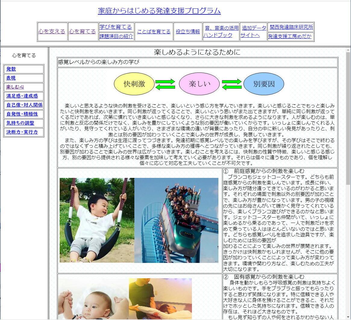 使いやすい玩具、教材、具体的活用方法の紹介などをホームページを見る要領で分かりやすく見ていただけるように、項目立てしています。これまで特別支援に関わってきた集大成ともいえるデータディスクです。発達支援プログラムとしての解説は、ベーシックガイドをご覧いただき、こちらのディスクを併用していただく形でご利用いただけるようにしています。