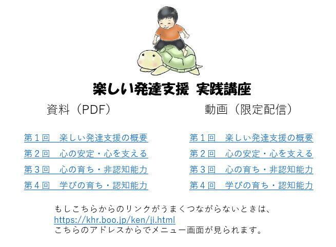 この講座は、楽しい発達支援の基盤となる「きんぎょモデル」の基礎的理解を受けて、実際の子どもたちはどういう様子なのかを紹介しています。子どもたちの様子と考え合わせながら「きんぎょモデル」の理解を深めていくことを目的に構成しました。